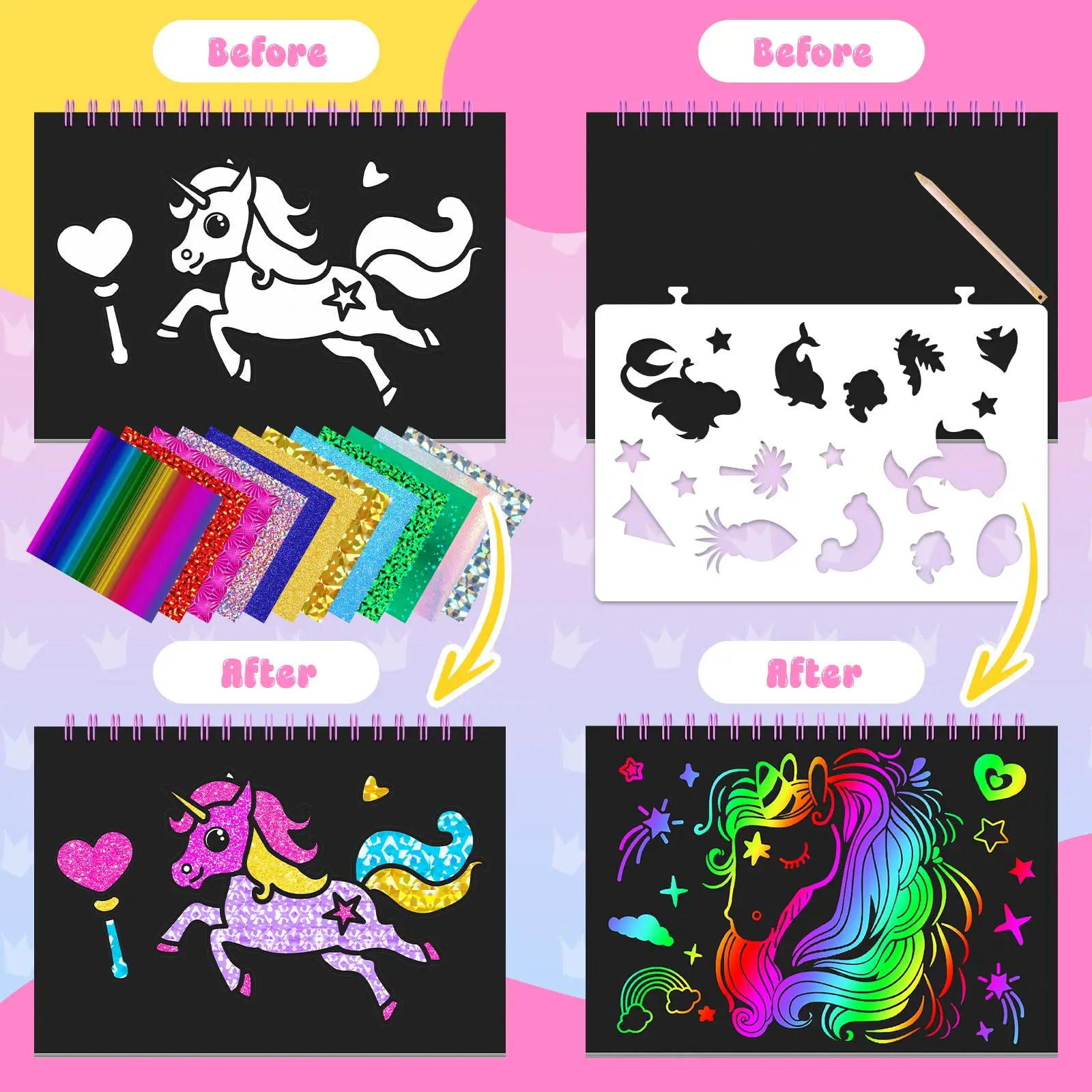 Easy-to-use Foil Set: For foil gameplay---select the pattern and tear off the protective film, apply glitter foil sheets to color the selected adhesive part and press it down. Feel free to add foil colors during this process to make the pattern look more beautiful! For the rainbowscratch-off art gameplay---Use the wooden stylus to scratch various patterns on the scratch art paper based on imagination or stencils. Unleash your kids's creativity with our foil art kit,allowing them to create magic artwork featuring themes like unicorns,princesses,and castles!