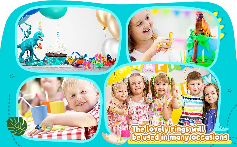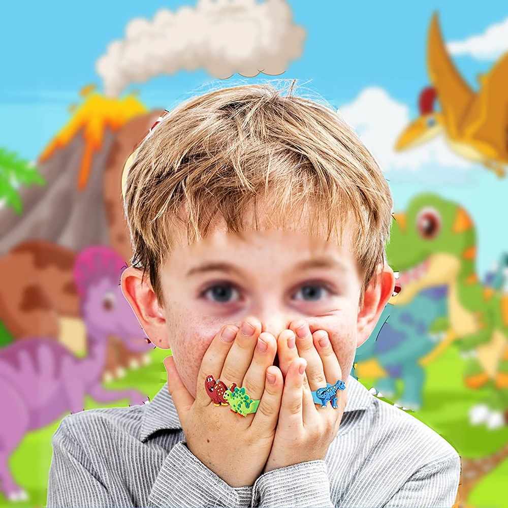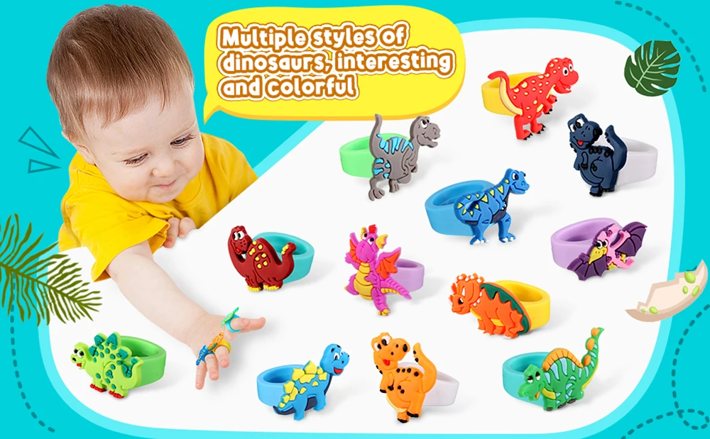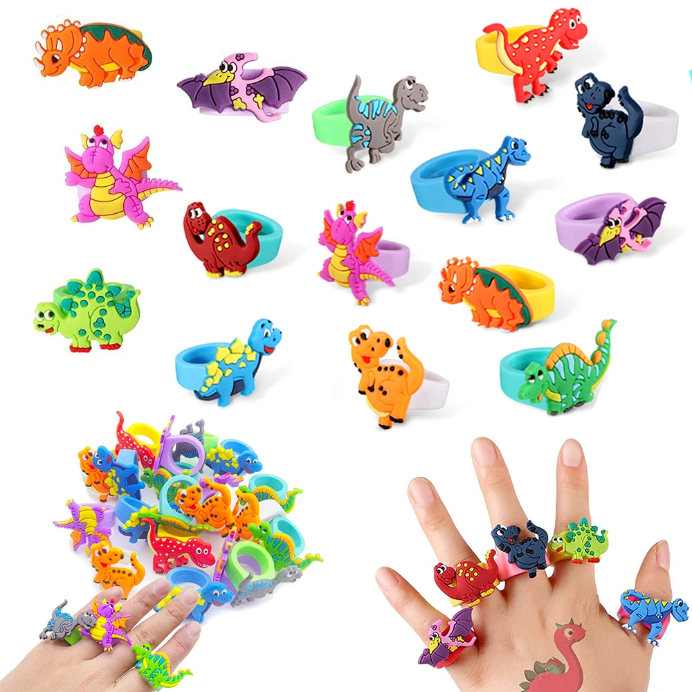 12Pcs Cartoon Dinosaur Rubber Rings Soft Dino Ring Kids Birthday Dinosaur Party Pinata Fillers Boys Girls Favors Suppies Toys
