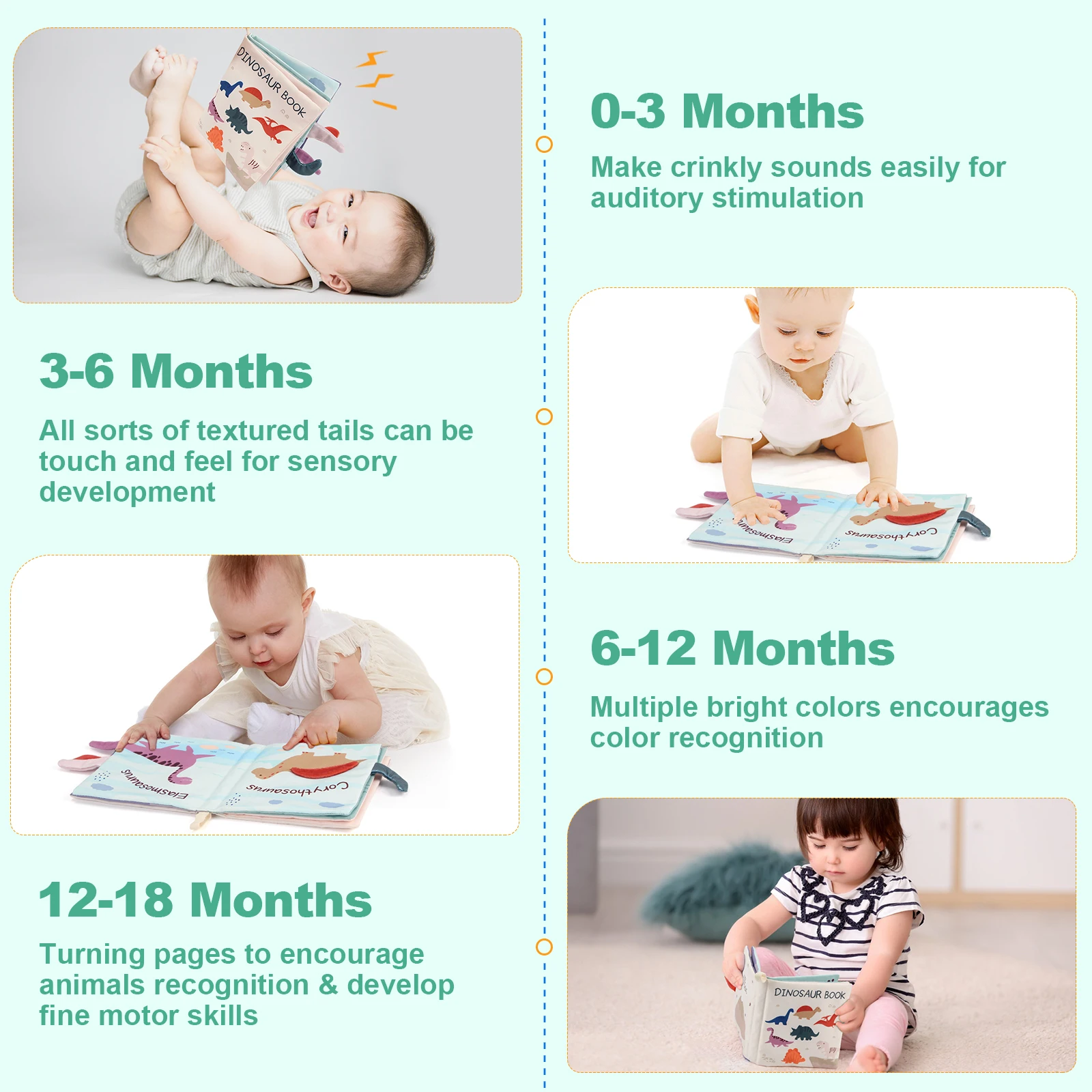 Name:17x16CM Tail Cloth Book Baby Soft Cloth Book Parent-child Interactive 0-36 Months Sensory Dinosaur Book Newborn Montessori Toy Age:0-36 months Material: Tail Cloth Book Color: as the picture shows Size:as the picture shows Weight:0.09kg