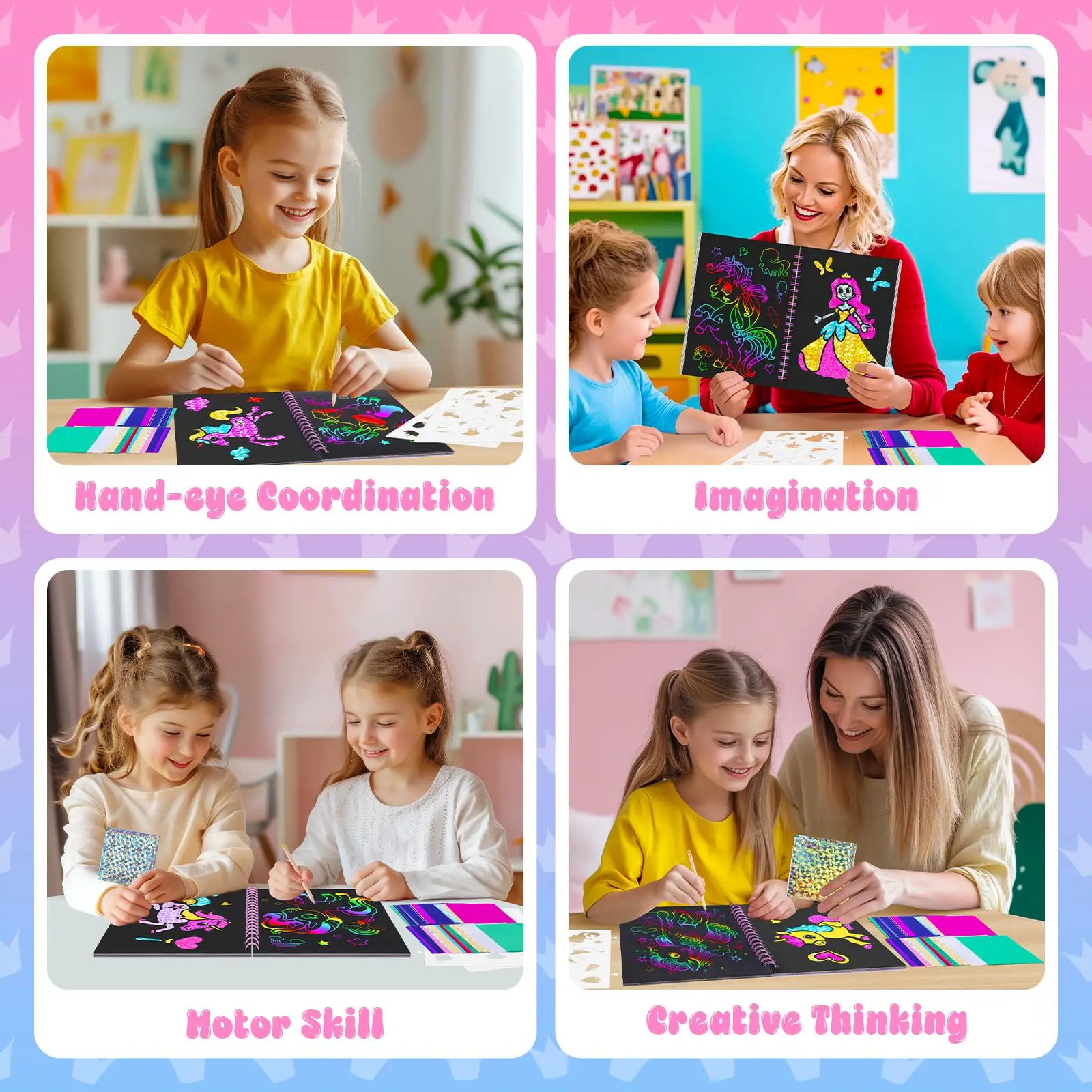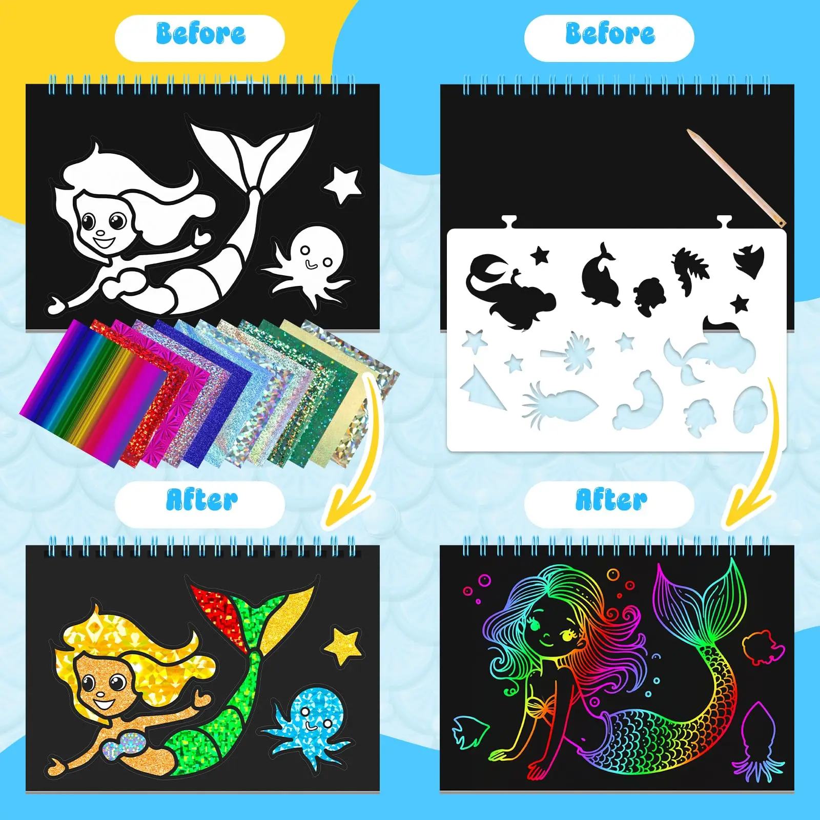 Easy-to-use Foil Set: For foil gameplay---select the pattern and tear off the protective film, apply glitter foil sheets to color the selected adhesive part and press it down. Feel free to add foil colors during this process to make the pattern look more beautiful! For the rainbowscratch-off art gameplay---Use the wooden stylus to scratch various patterns on the scratch art paper based on imagination or stencils. Unleash your kids's creativity with our foil art kit,allowing them to create magic artwork featuring themes like unicorns,princesses,and castles!